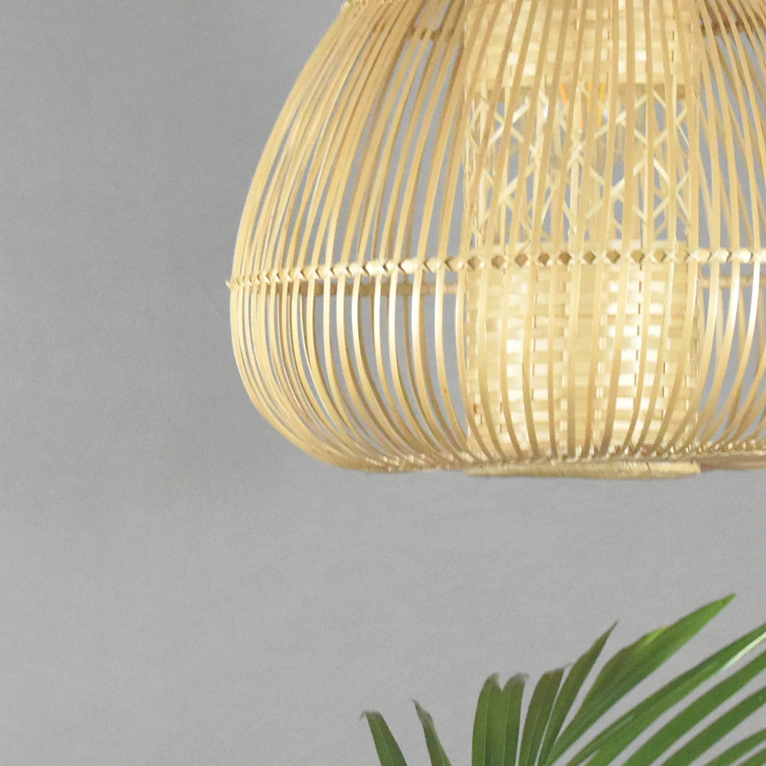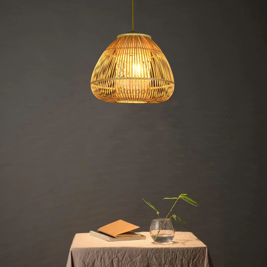 Expertly handcrafted from sustainable bamboo and rattan, this pendant light shade boasts a unique mushroom design. Add a touch of nature to your space while supporting eco-friendly materials. Elevate your decor with this one-of-a-kind, handmade lamp. This ceiling light fixture adds a touch of nature to your home decor while providing soft and warm lighting.