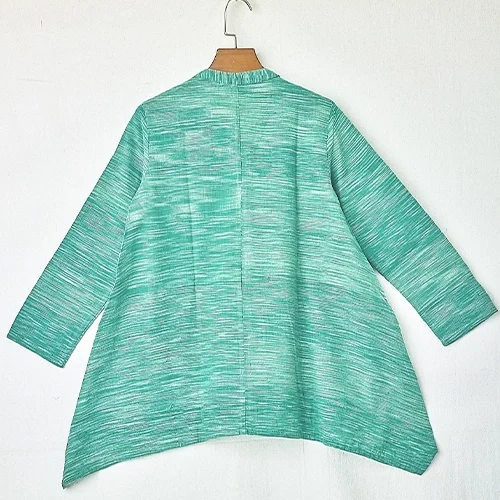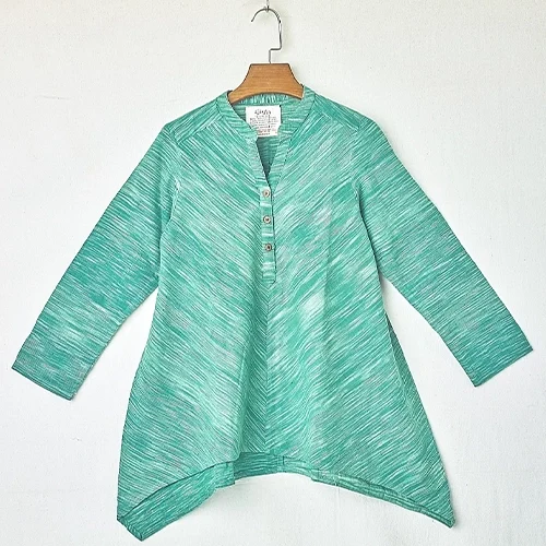 Mandarian neck, asymmetric hem, Short Top With 3/4th Seelve and coconut shell button opening. Made from rainfed organic cotton which is handspun, handwoven and naturally dyed.