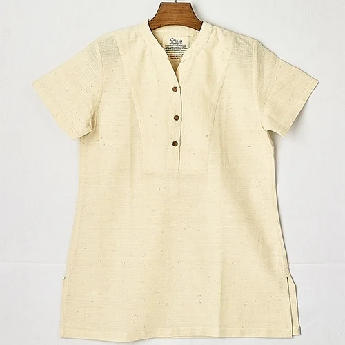 Mandarian Neck , Half Sleeves, straight cut top with slide slit and front opening using coconut shell button. Made from rainfed organic cotton which is handspun, handwoven and naturally dyed.